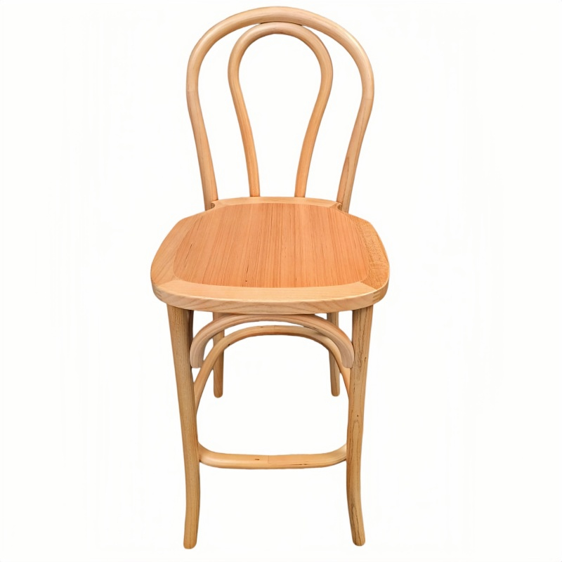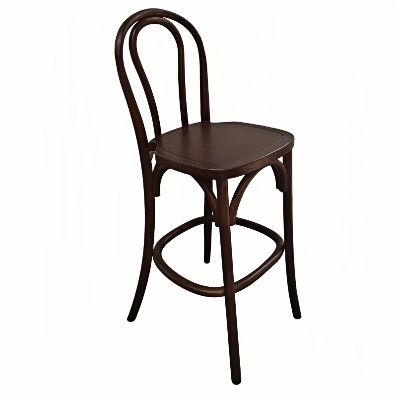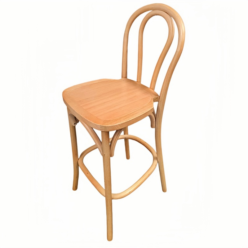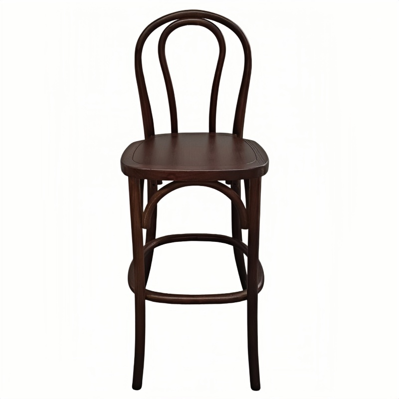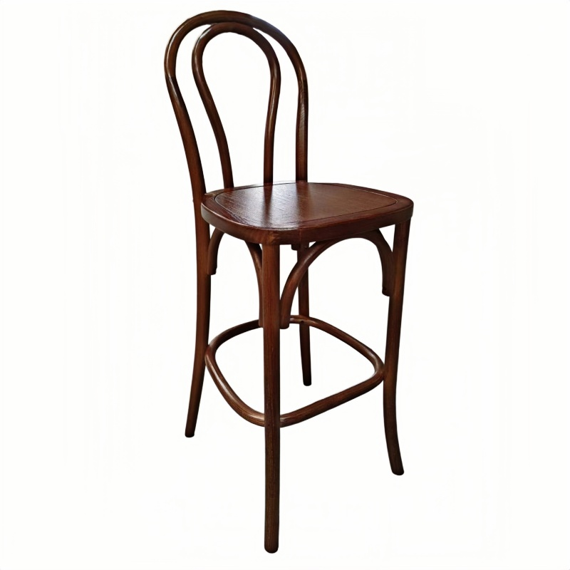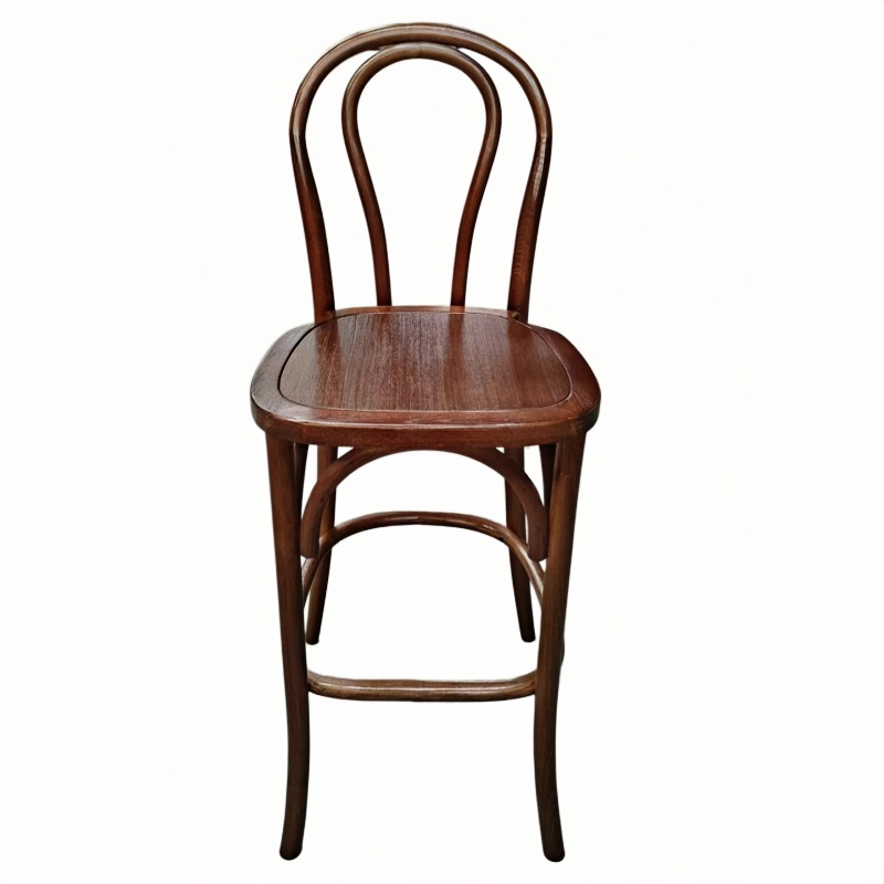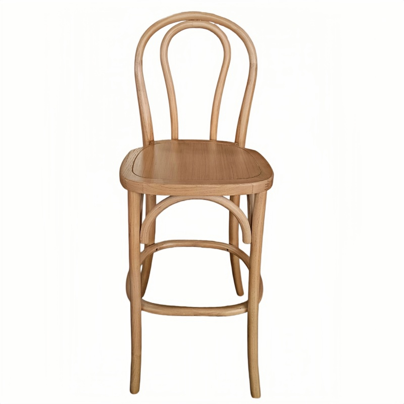 Our bentwood bar stool, featuring a solid wood seat, seamlessly blends classic European design with reliable commercial-grade durability. The frame is crafted from high-quality solid wood, with graceful curves that embody the iconic bentwood aesthetic; the solid wood seat not only enhances structural integrity but also lends the stool a natural, rustic charm. Combining both beauty and functionality, this bar stool is lightweight yet structurally robust, making it easy to move and arrange in a wide variety of flexible settings. Whether placed in a café, restaurant, bar, or event venue, these solid wood bentwood bar stools integrate perfectly into their surroundings, creating a warm and inviting atmosphere.