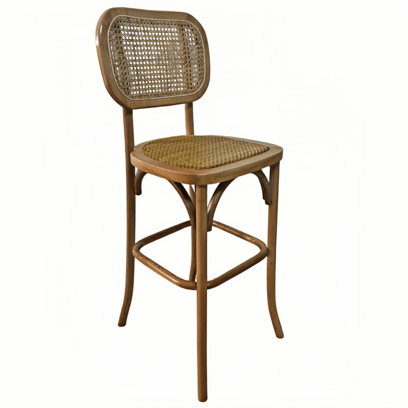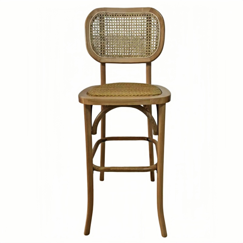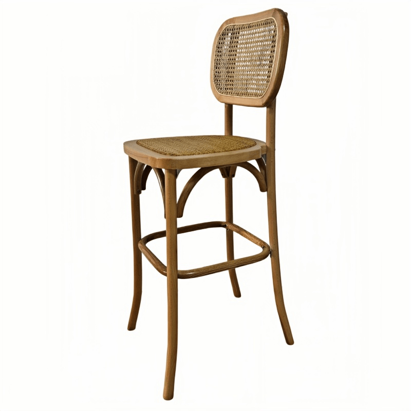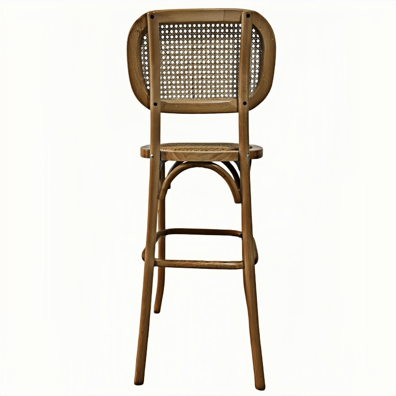Both the backrest and seat of this rattan bar stool are crafted from high-quality rattan, meticulously hand-woven by our factory’s experienced artisans. The tightly and uniformly woven structure ensures excellent load-bearing capacity while providing superior breathability, ensuring a comfortable seating experience for guests even during prolonged periods of use. Furthermore, the unique texture inherent to natural materials lends each stool an air of exquisite sophistication and premium quality. This bar stool also features a reinforced solid wood support frame complemented by a circular footrest at the base, significantly enhancing its overall stability.