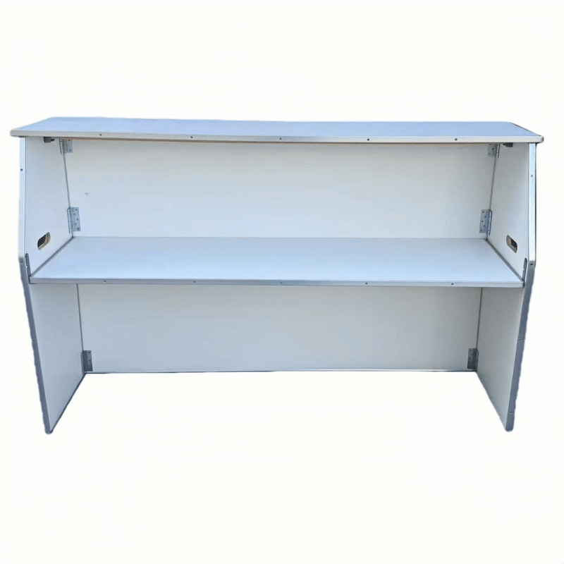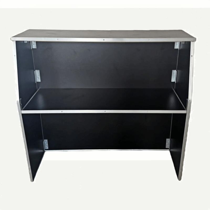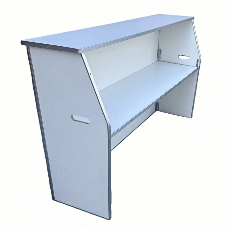 A practical storage shelf is located beneath the tabletop, providing space for tableware, supplies, or service items, helping to keep the tabletop neat and organized. The side panels have convenient carrying handles, making it easy to transport and move, especially suitable for frequent use and rental scenarios. The table’s overall design is sturdy and suitable for various event styles, making it a commonly used functional buffet table in event and catering services.
