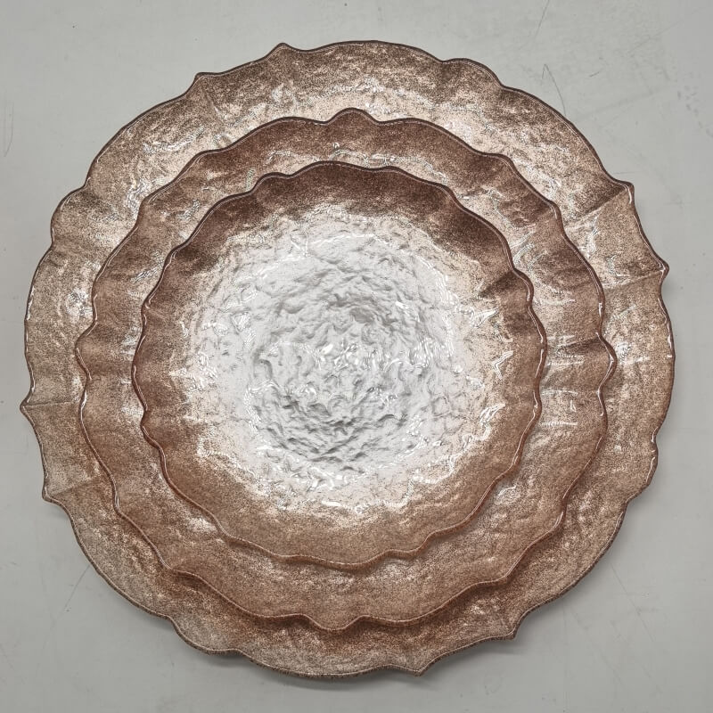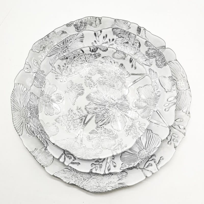 This glass charger plates is specially designed for weddings and banquets. Made from high-transparency glass, the plates are clear and transparent, with a pure and natural texture. Under the illumination of lights and complemented by floral arrangements and tablecloths, it effectively enhances the overall table setting and sense of occasion. The plates undergo molding and annealing processes, resulting in a stable structure that is not easily deformed, with smooth and delicate edges, making them both beautiful and safe. Whether used for wedding head tables, banquet settings, or buffet displays, it presents an elegant and sophisticated visual effect, making it an ideal choice for wedding decorations and banquet displays, combining both decorative and practical functions.