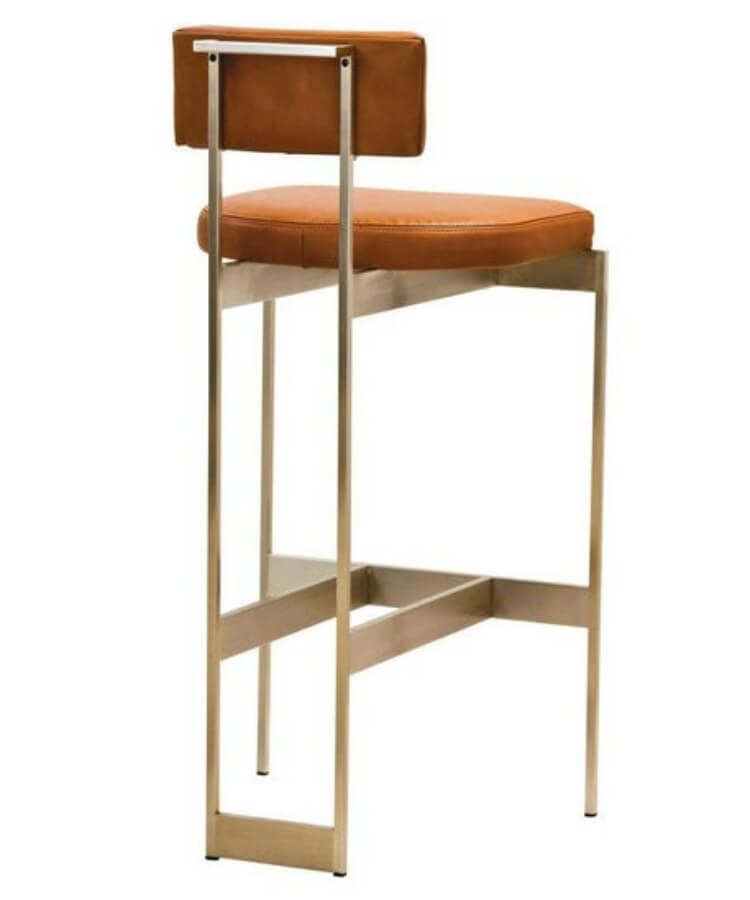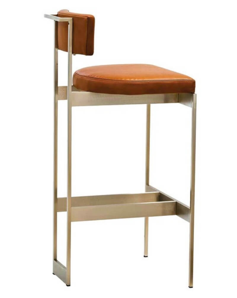 This metal bar chair is designed with a minimalist and modern style. It features a brushed metal frame, and its surface treatment presents a low-key, luxurious metallic finish. The brown leather cushion fits the backrest perfectly, which is soft but supportive. It can be used for long-term sitting and lying, and is convenient for daily cleaning. The chair legs are slender and upright, and the front and rear horizontal braces are formed in one piece. It not only greatly improves the structural stability and load-bearing capacity, but also features a footrest area to keep your legs relaxed at all times. Whether it is an island bar at home, a bar area in a coffee shop, or a casual corner in a restaurant, it can inject a modern atmosphere of elegance and style into the space with its capable lines and warm colours.