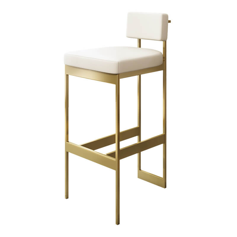 This bar stool boasts a simple yet elegant design, featuring a gold metal frame and a white, upholstered