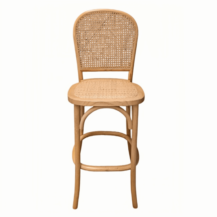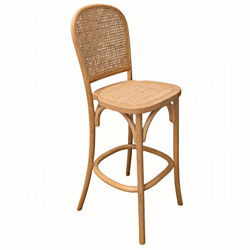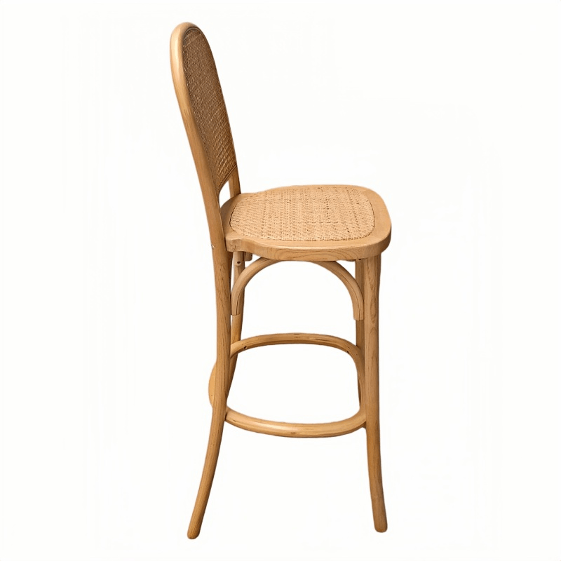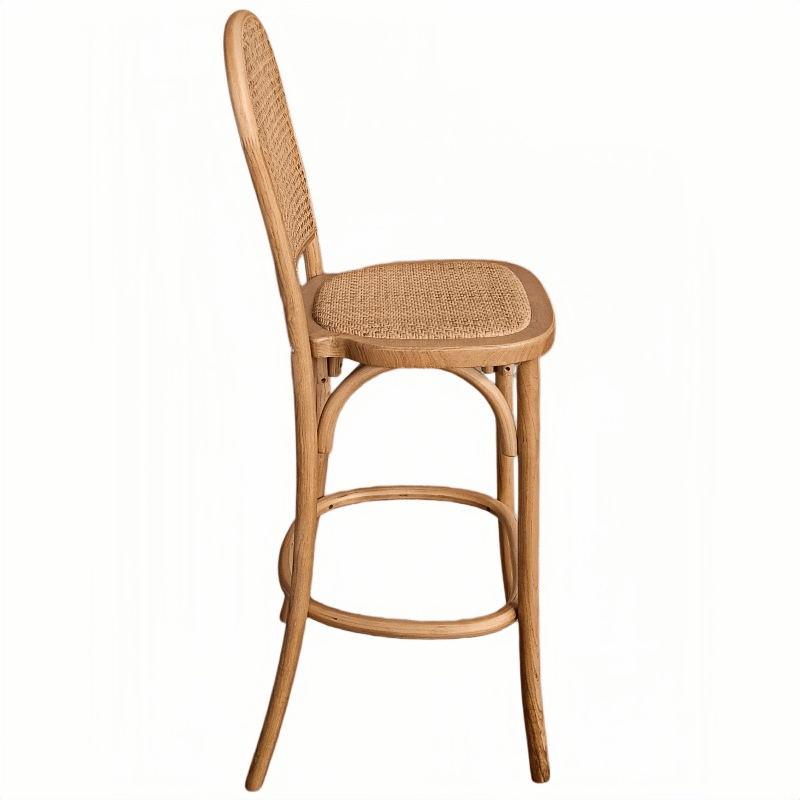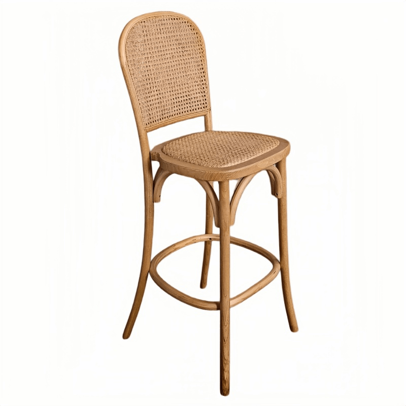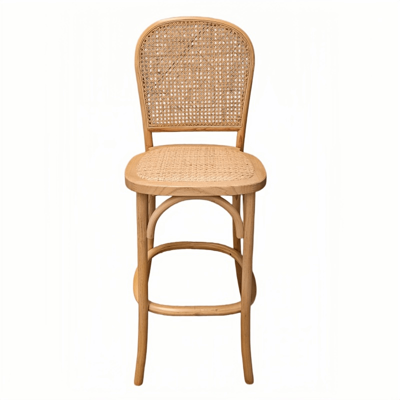 This bar stool features a solid wood frame paired with a seat and backrest crafted from natural woven rattan, perfectly blending the rustic beauty of natural materials. Its stackable design facilitates easy arrangement and storage, making spatial planning effortless. The stool arrives fully assembled—requiring no self-assembly—and features splayed legs that ensure exceptional stability and support. Creating an atmosphere of tranquility and leisure, this bar stool seamlessly combines comfort with stylish elegance.