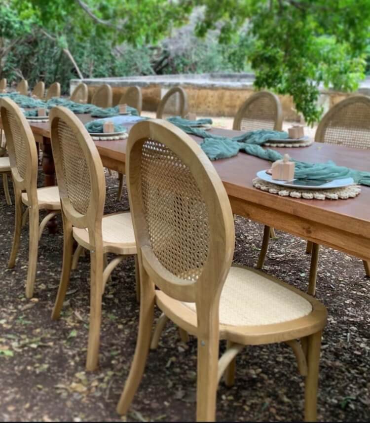 in outdoor wedding or dinner scenes. The picture shows our classic French round-back rattan chairs, which