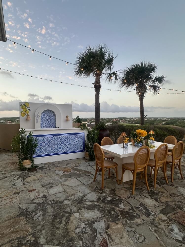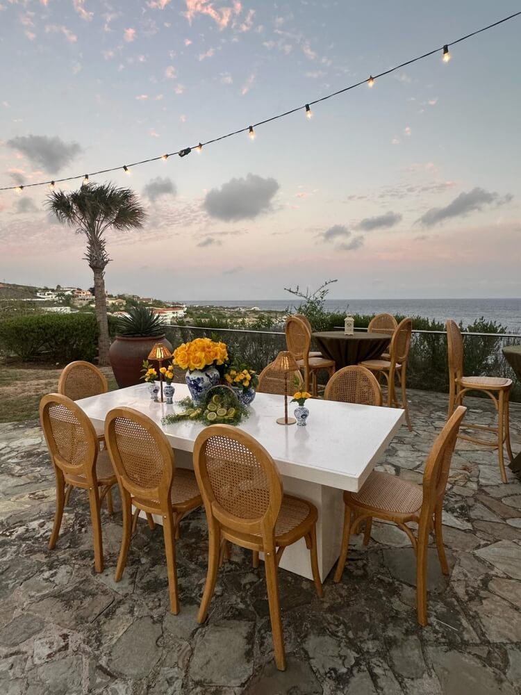 which looks particularly warm and romantic against the backdrop of the sunset by the sea. The tabletop