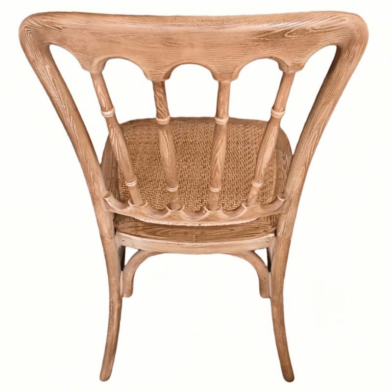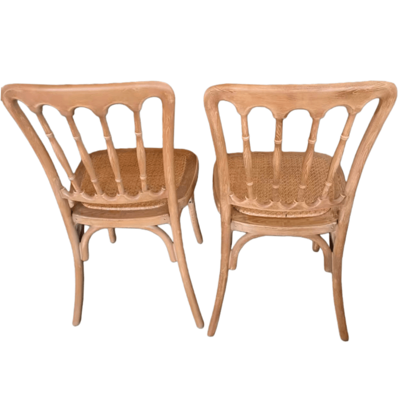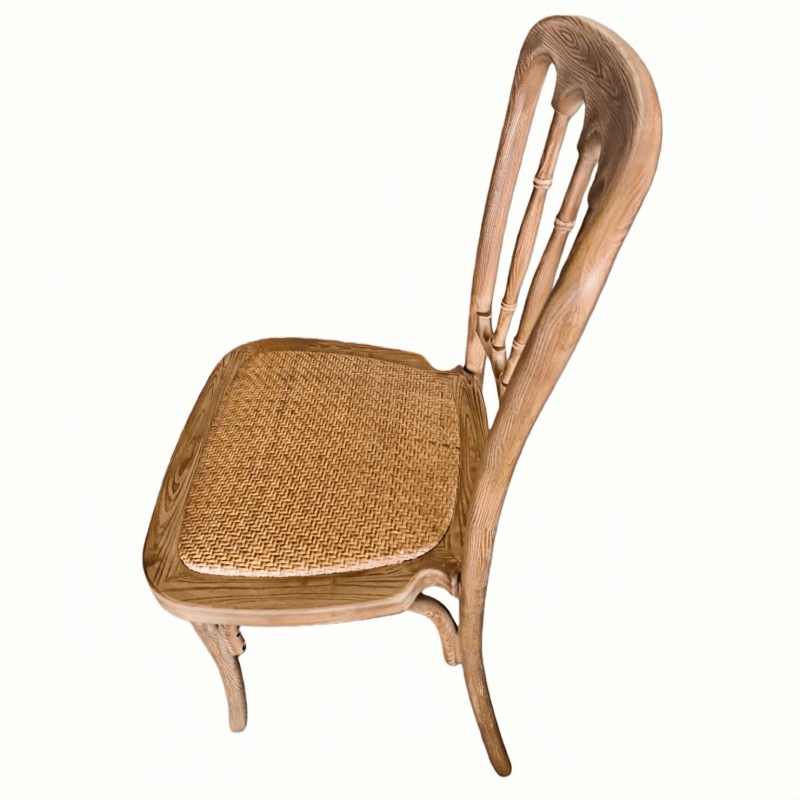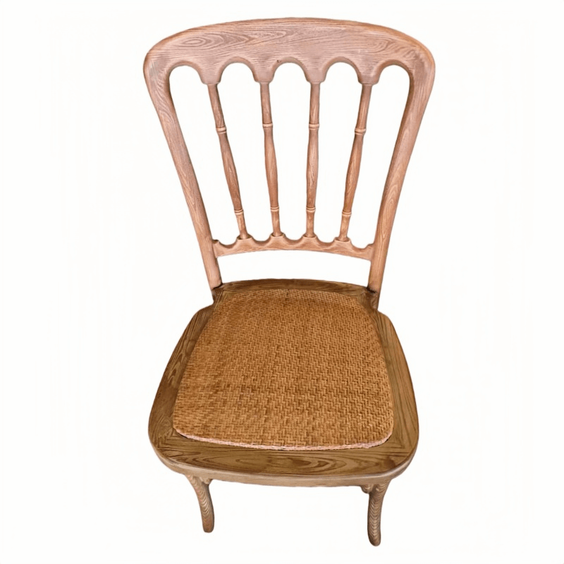 This resin wood-look wedding chair combines the warm texture of natural wood with the durability of premium resin. Featuring a realistic wood grain finish and rattan-style seating, this resin Napoleon chair exudes classic elegance, perfectly suited for weddings and various events.