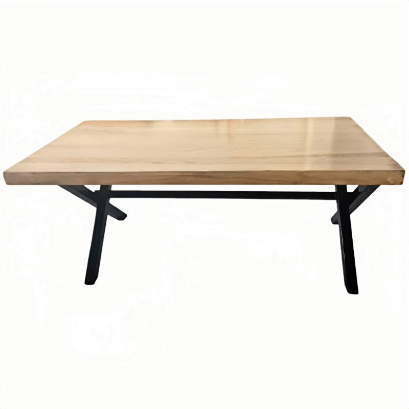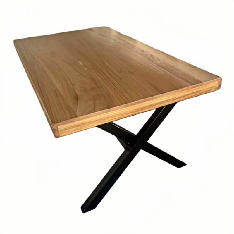 This solid wood dining table is supported by a metal X-shaped base, designed to provide strong structural