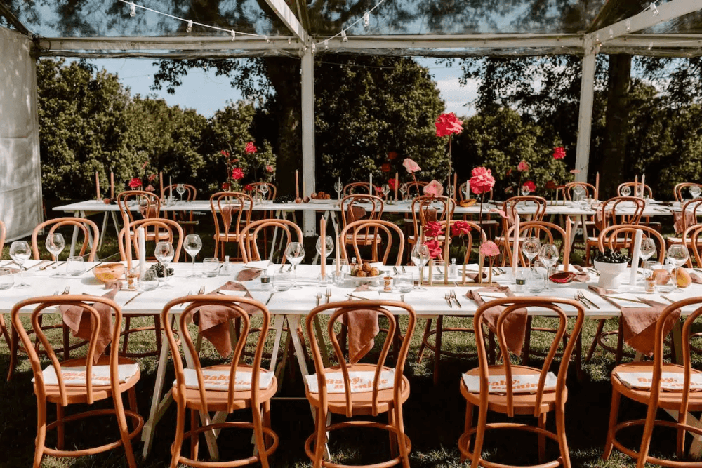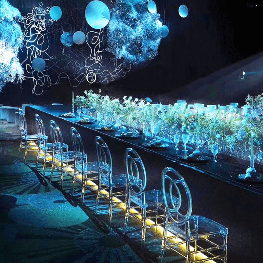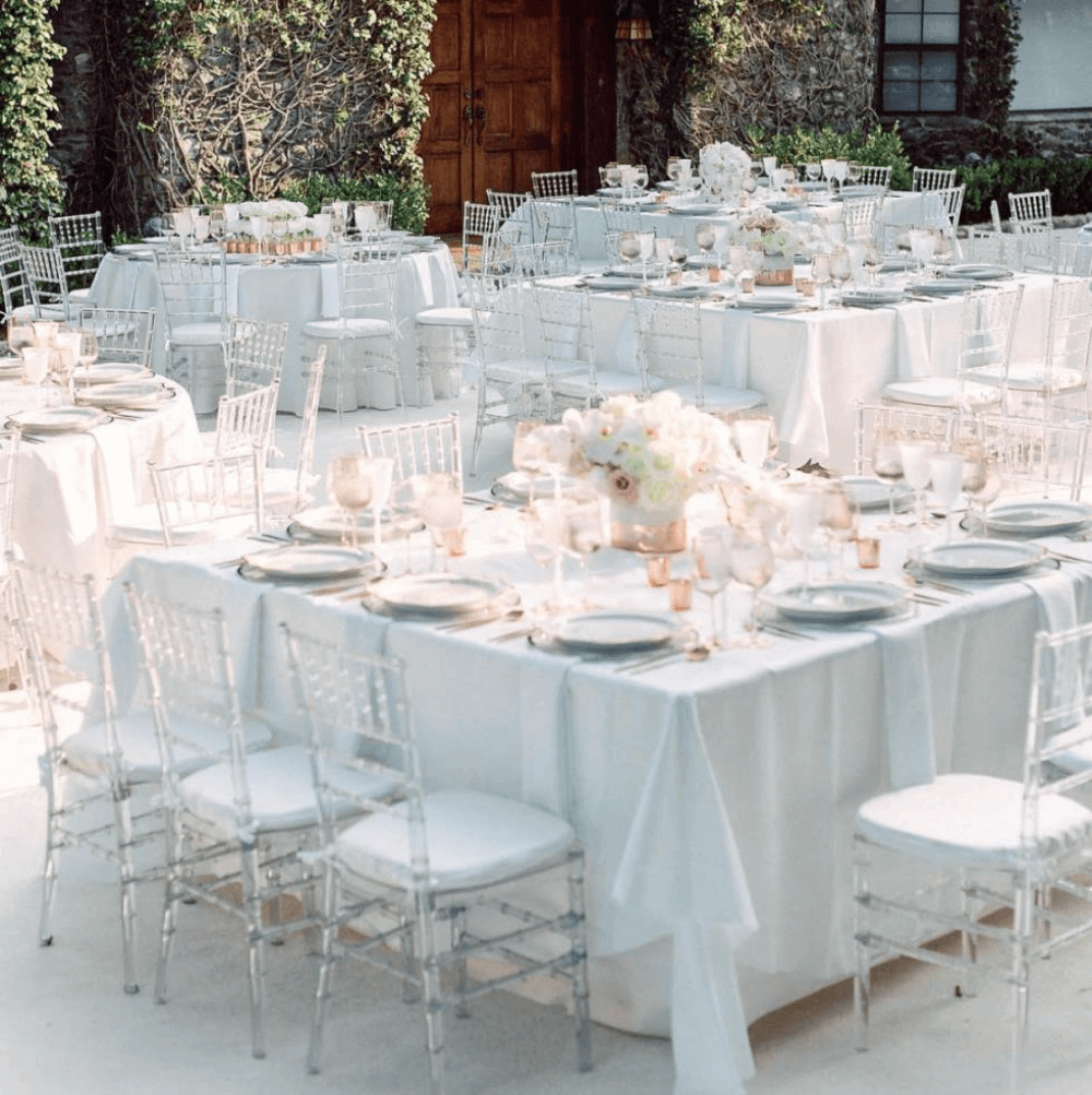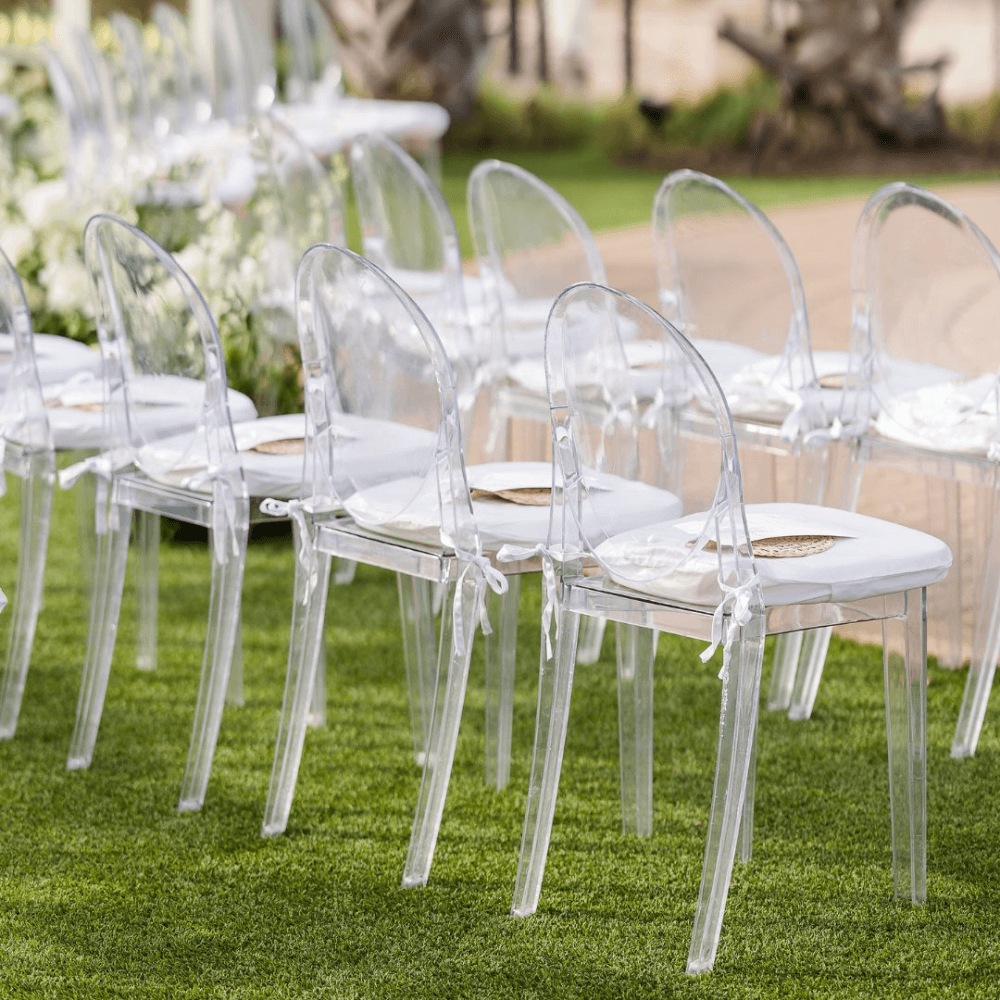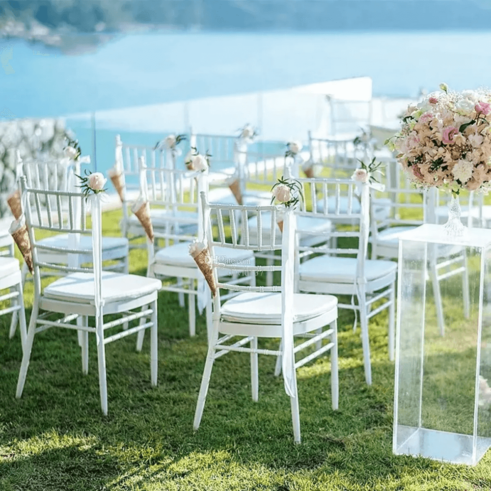 Moreover, you can find Chiavari chairs in various materials, including wood for traditional events, resin and aluminium for reliability, and clear Acrylic (often known as Ghost Chiavari) for modern looks.