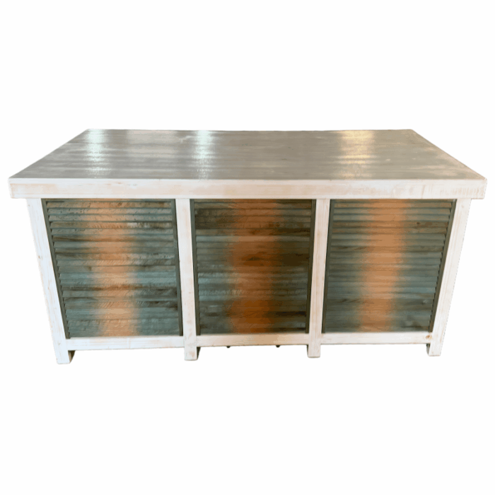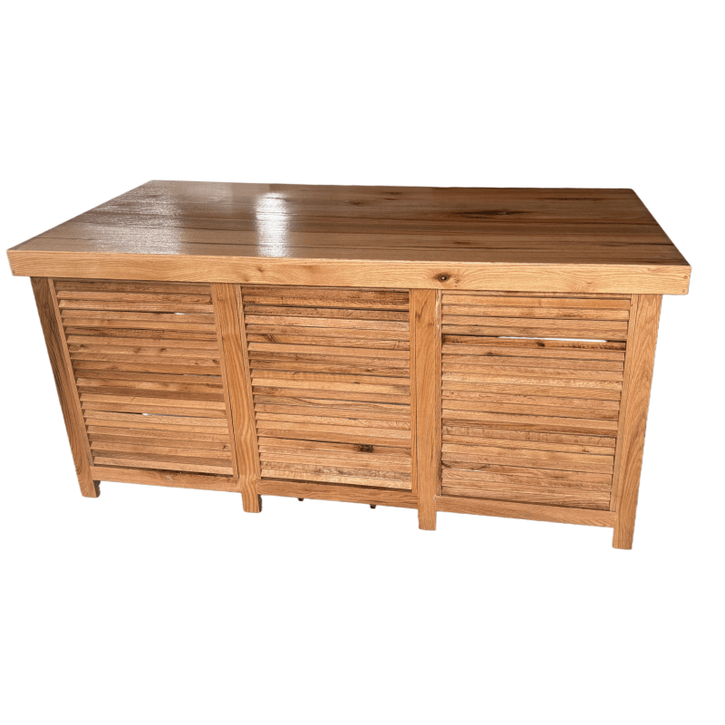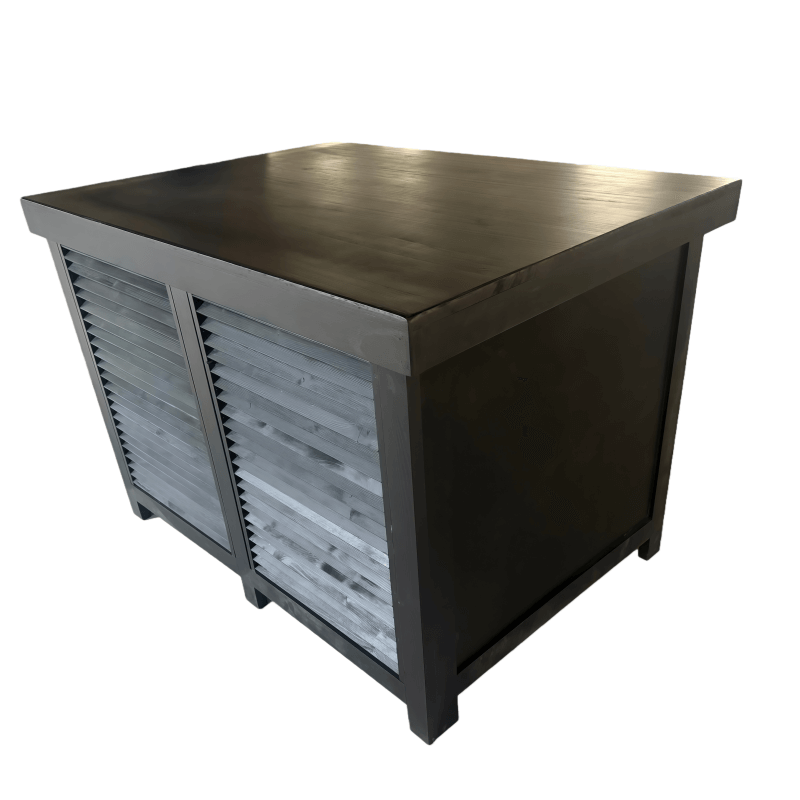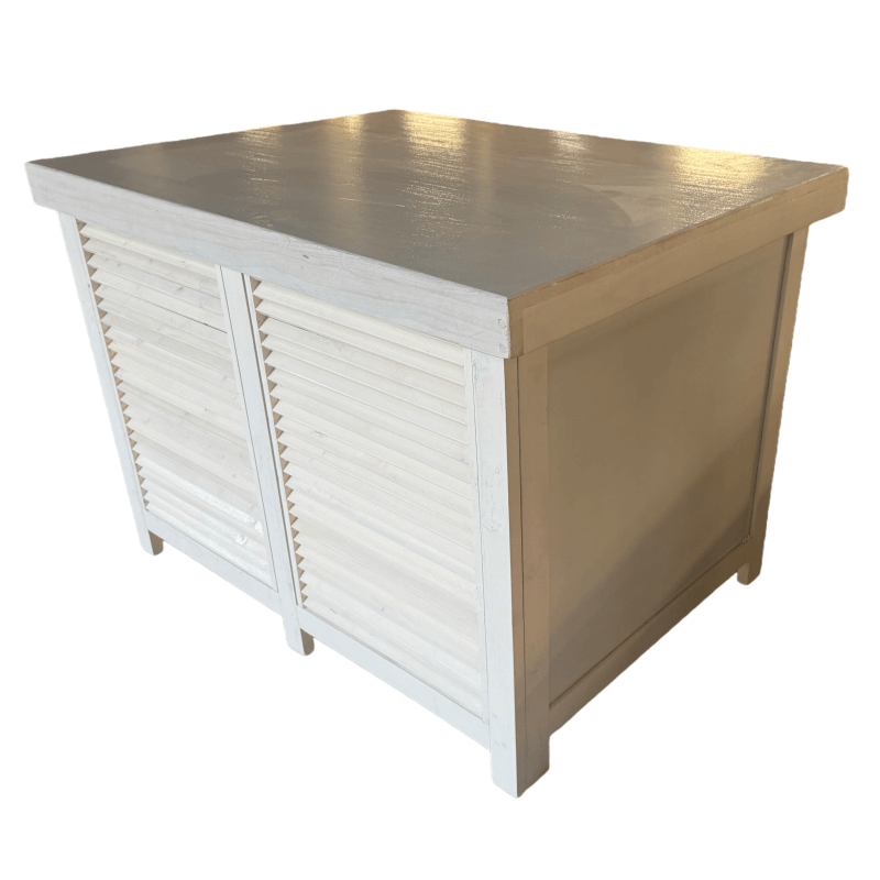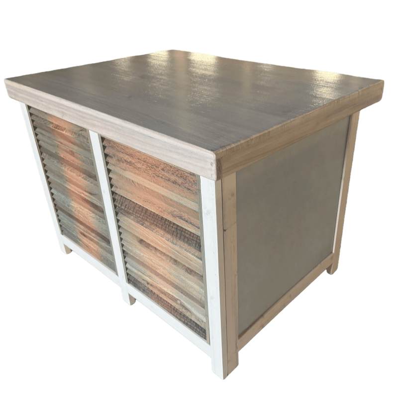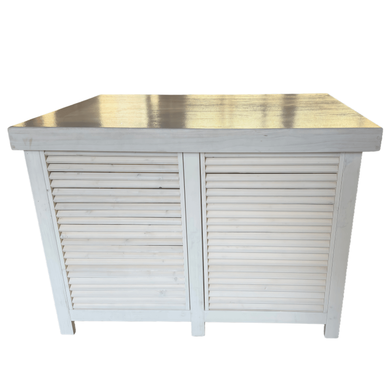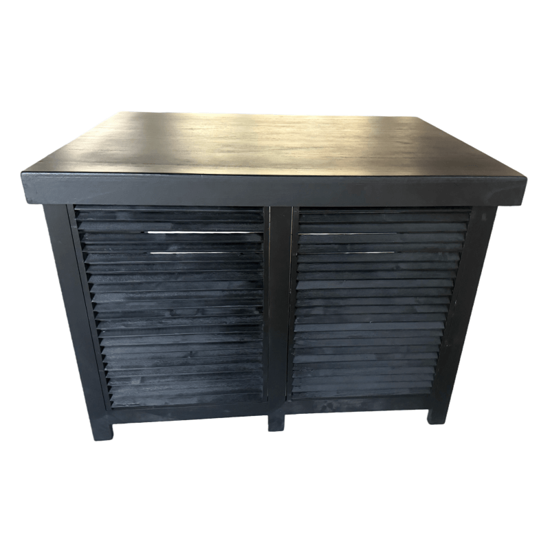 The catering table doors feature a louvered design, consisting of multiple wooden slats evenly spaced and