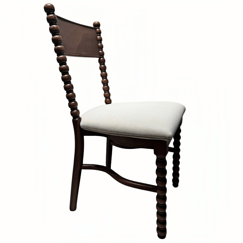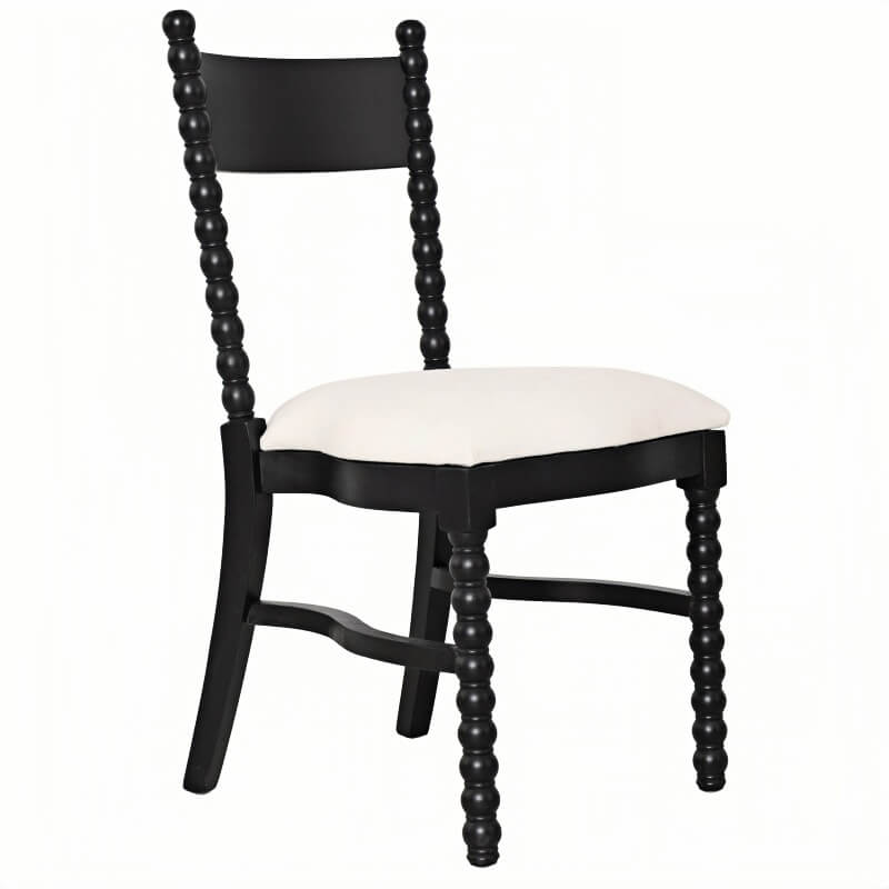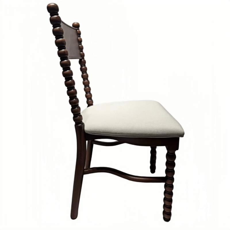Our spool dining chair is crafted from carefully selected solid wood, combining classic design with reliable durability. The elegant turned spool legs create a distinctive decorative look, while the reinforced frame ensures stability for commercial use. Each wooden dining chair features a smooth black finish and a comfortable upholstered seat cushion that provides both support and style. The light-colored cushion contrasts beautifully with the dark wood frame, making the chair suitable for dining rooms, restaurants, weddings, and event venues. Designed for long-term use and wholesale supply, this chair offers a balance of craftsmanship, comfort, and durability, making it a practical choice for hospitality and event businesses.