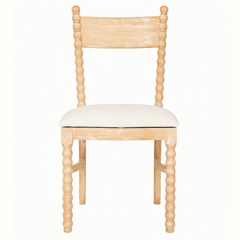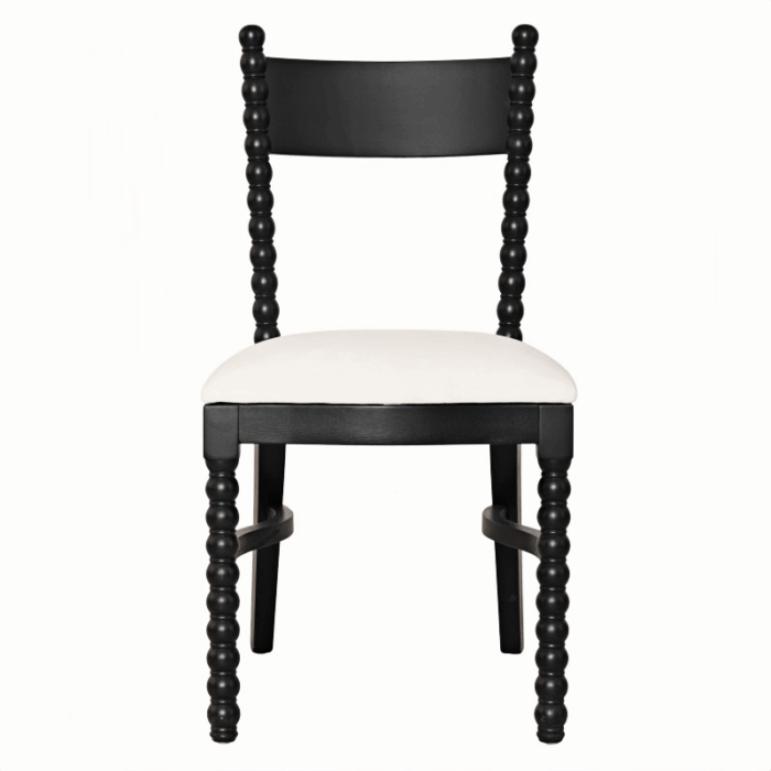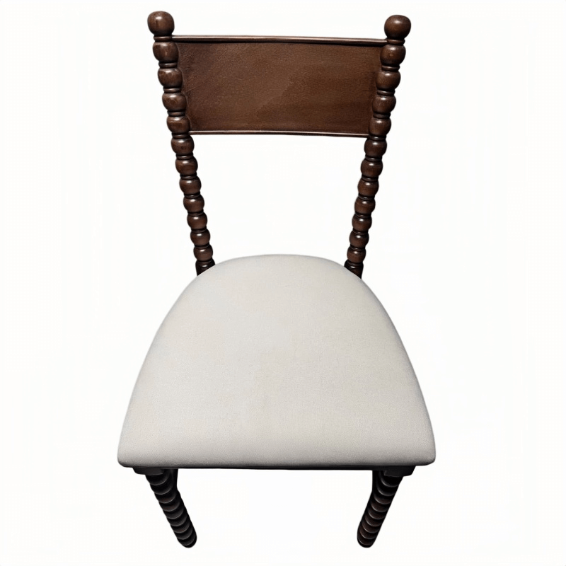 One of the most distinctive design features of this dining chair is its unique spool-shaped legs and backrest